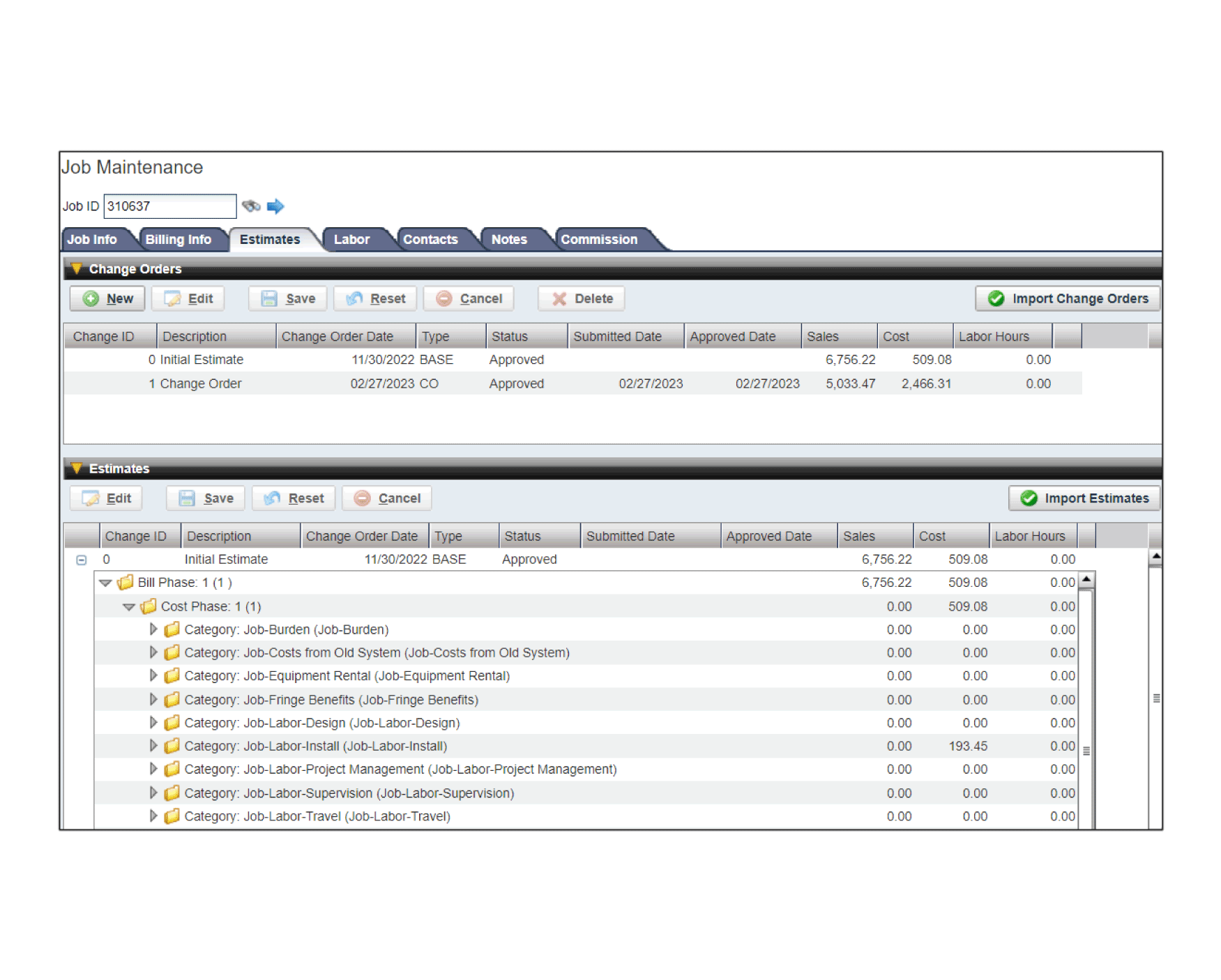 Enter sales and cost estimates tied to your accounting, add revisions and change orders.